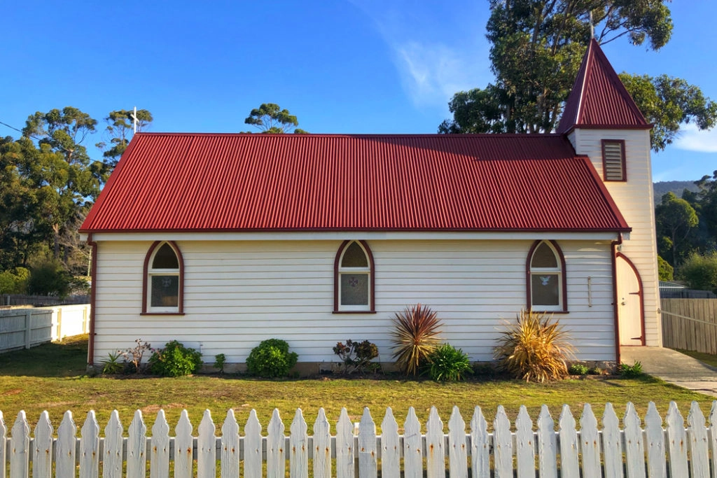 Next to the shop is the quirky Penguin and Pardalote cafe and the cute building of the church behind a white picket fence.