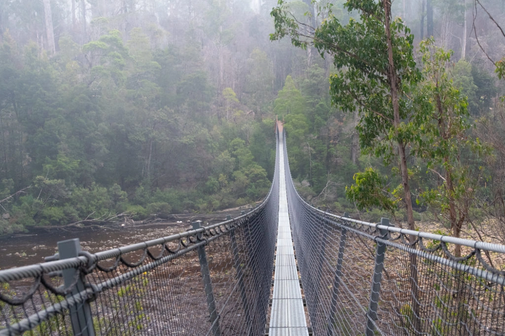 When we finally arrived at Tahune AirWalk and stepped out of the bus, it was probably 10 degrees colder than in Hobart. We walked through the mist-shrouded forest, gradually climbing over a hundred steps to the start of the steel canopy bridge. A smaller version of Illawarra Fly in NSW Kangaroo Valley, Tahune AirWalk stretches for 610 meters 30 meters above the forest floor, with the final cantilever section projecting at a height of 50 metres above the Huon River.