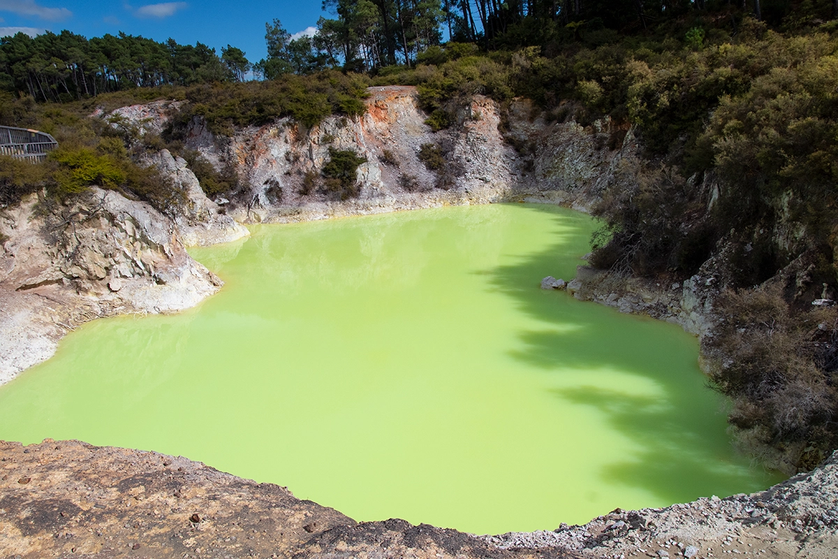 In its mineral banding and sinter formation, Champagne Pool is often compared to the great hot springs of Yellowstone National Park, where similar processes create equally vivid geothermal landscapes. Despite its beauty, however, the water is highly toxic, and even brief contact would cause serious burns.